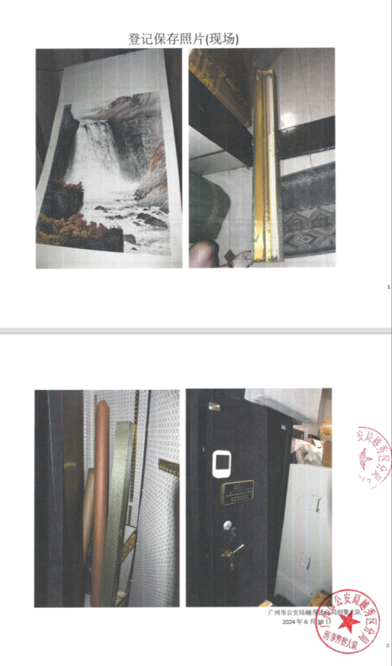 邓先生表示第一次知道《天池飞瀑》涉嫌刑案是在2024年6月,广州警方通知,外省市警方通知办理一起刑案时发现《天池飞瀑》涉案,广州越秀区警方决定对涉案物品采取证据保全措施,虽然没有直接拿走《天池飞瀑》,但拿走了保存《天池飞瀑》的保险柜钥匙。邓先生说:“我们经了解得知,《天池飞瀑》在拍卖前流转过几手,其中一次流转涉及一宗刑事案件,现在保险柜还在公司,但是他们要求不得擅自处置。”