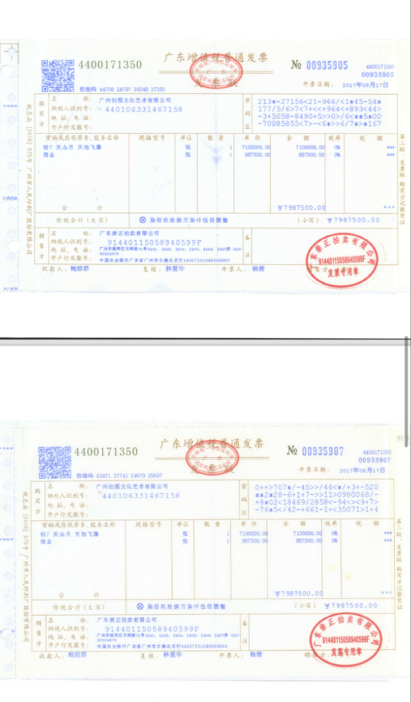 邓先生提供的拍卖付款通知书显示,2017年8月,其公司向崇正拍卖公司为《天池飞瀑》支付15,975,000元,其中佣金177,500元。2017年8月17日,崇正拍卖公司开具了增值税发票。双方交易完成。